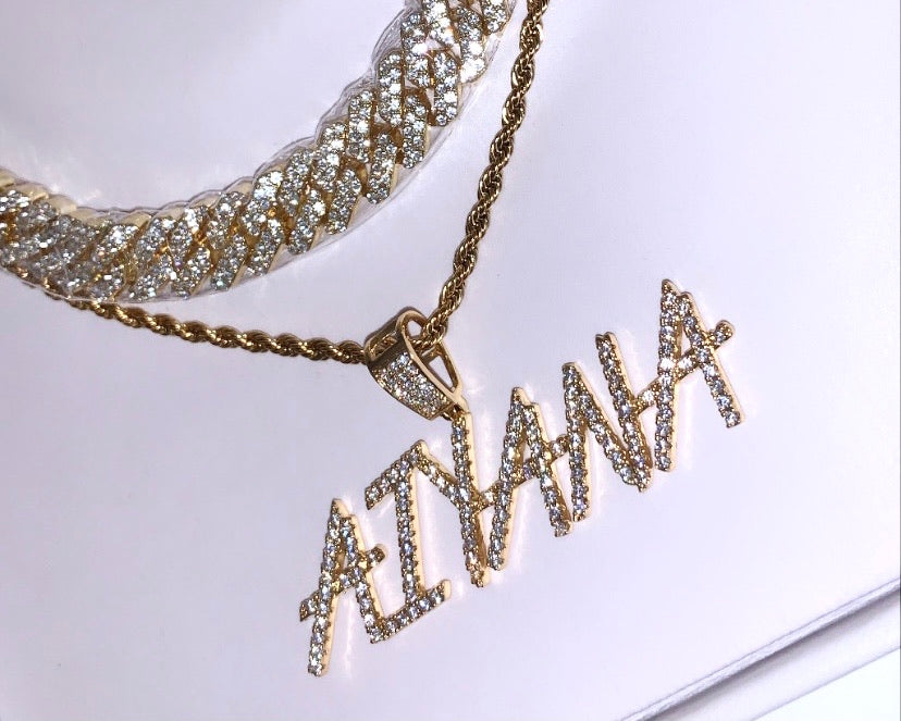It's in the name! Our Icy Font custom Necklace features eye-catching cubic zirconia stones along the letter surface, giving this piece its icy feel. Choose to purchase this pendant on a 18" rope chain for a more subtle look, or go fully iced out with a 16" or 18" tennis chain. This piece is perfect to wear for special occasions too!